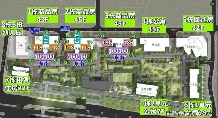 项目共由8栋建筑组成,其中1栋住宅总高43层,2栋住宅总高46层,3栋住宅总高48层,5栋住宅总高32层,4栋公寓总高40层,6栋1单元公寓总高32层,6栋2单元公寓总高7层,7栋保障房总高22层(包含公共租赁住房及租赁型人才住房),另外配建1所幼儿园。