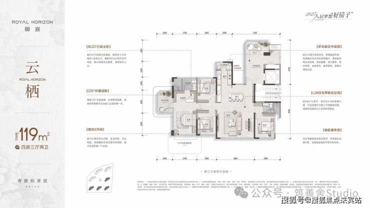 建面约119㎡的户型,实用率高达约145%,相当于拥有约172㎡的实用面积,比100%实用率的标准多出一套53㎡的小公寓!步入家门,首先映入眼帘的是超27㎡的多功能空中庭院。室内采用LDKG一体化设计,将厨房、餐厅、客厅、阳台巧妙融合,实现“零过道、零浪费”,轻松打造约48㎡的超奢巨幕厅。客厅南向全墙无遮挡,实现真正意义上的全面屏采光。主人独享约41㎡的酒店行政级主卧套房,内设独立卫浴与步入式衣帽间。此外,还有约8.4㎡的阔绰空中花园,挑高达约6.3米,尽显空间奢华。