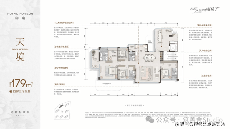 建筑面积约179㎡的奢阔大平层,堪称“终极改善”典范,实际使用面积达260㎡!双厅空间拓展至68㎡,客厅开间升级为7.5米宽景设计。层高更是提升至3.5米的非凡高度。全屋配备4个卫生间,并优化为3套独立卫浴格局。超65㎡的主卧套房,堪比五星酒店总统套房的奢华体验。宽敞的主卫空间,轻松容纳超大浴缸,尽享沐浴时光。另有约12㎡的独立功能房,搭配软隔设计,可灵活变身母婴房、电竞房或瑜伽室,满足多元生活需求。约13㎡的阔尺空中花园,层高约7米,领先中山市场四代住宅的标杆尺度。