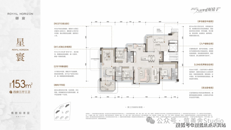 建面约153㎡户型,作为119㎡户型的升级之作,不仅保留了原户型的所有优点,更在空间尺度上实现了全面跃升!空中庭院扩大至约34㎡,双厅空间拓展至约60㎡,客厅开间达到7米级别,南向采光面宽达7开间,每一处尺度都令人惊叹。入门处预留的超大储物柜空间,让收纳能力再升级;厨房新增的生活阳台,则为洗衣机、清洁工具等杂物提供了专属收纳区。