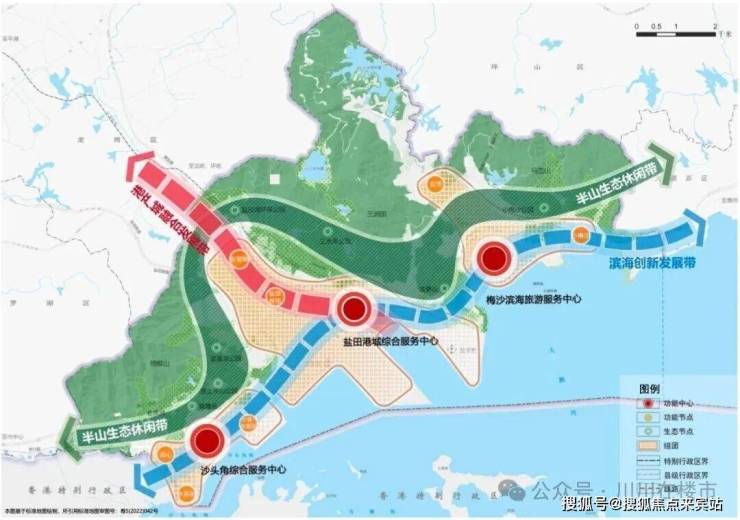 进一步提升为“梅沙黄金海岸旅游区”。盐田结合"七分山、三分城、一面海”地理特征,规划“三带、三心、三组团”,定位为深港国际消费合作区、世界级滨海旅游目的地、国际航运枢纽和离岸贸易中心、现代海洋城市示范区、东部滨海区域的综合性服务中心。