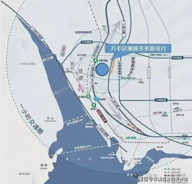 从宝安机场客运码头出发,可以到达香港、澳门、广州、珠海、中山5座城市。陆路交通已经形成“两横三纵”,“两横”是项目南北两侧的南环路、新沙路,“三纵”是项目西侧宝安大道、东侧中心路和107国道。高速方面拥有“四大高速”,广深高速、京港澳高速、广深沿江高速、外环高速等