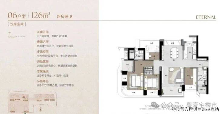 126m²的4房2厅2卫,设计的是竖厅南北通透格局,客厅3.9米开间,客餐厅分离化设计,五开间朝南,主卧套房270°环幕凸窗+私享阳台,七大凸窗+设备平台,分别做到了主卧20.23㎡/次卧9.92㎡/次卧9.3㎡/次卧8.77㎡(实测面积,去掉墙体),U型厨房,卫生间干湿分离,得房率超90%(包含赠送),正南朝向,看皇岗公园。