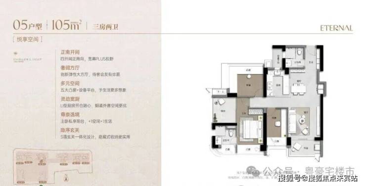 105m²的4房2厅2卫,设计的是经典竖厅格局,客厅3.4米开间,LDKB一体化大方厅,S墙设计预留冰箱卡槽位,四开间朝南,动静分区,五大凸窗+设备平台,分别做到了主卧11.82㎡/次卧11.54㎡/次卧7.65㎡/次卧6.3㎡(实测面积,去掉墙体),U型厨房,卫生间干湿分离,得房率超90%(包含赠送),阳台实测5.04㎡正南朝向,看皇岗公园。