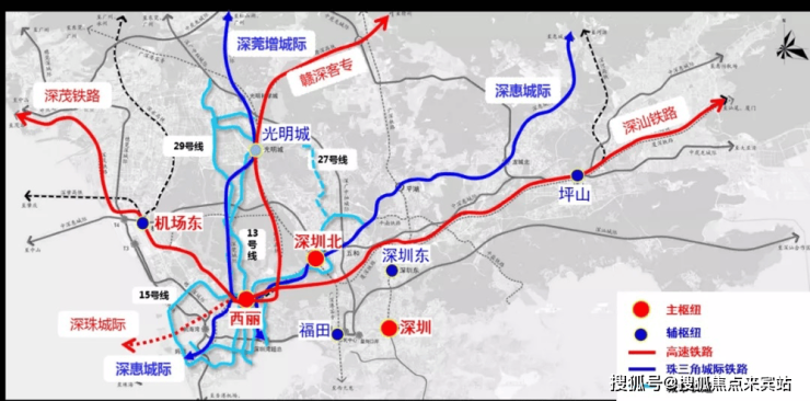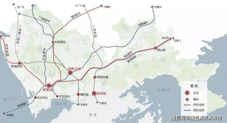 西丽综合交通枢纽作为深圳国家铁路客运“三主四辅”的主枢纽之一,将拟建深茂铁路深江段、规划广深港新通道,同时还规划衔接深汕、深珠等大湾区城际铁路。