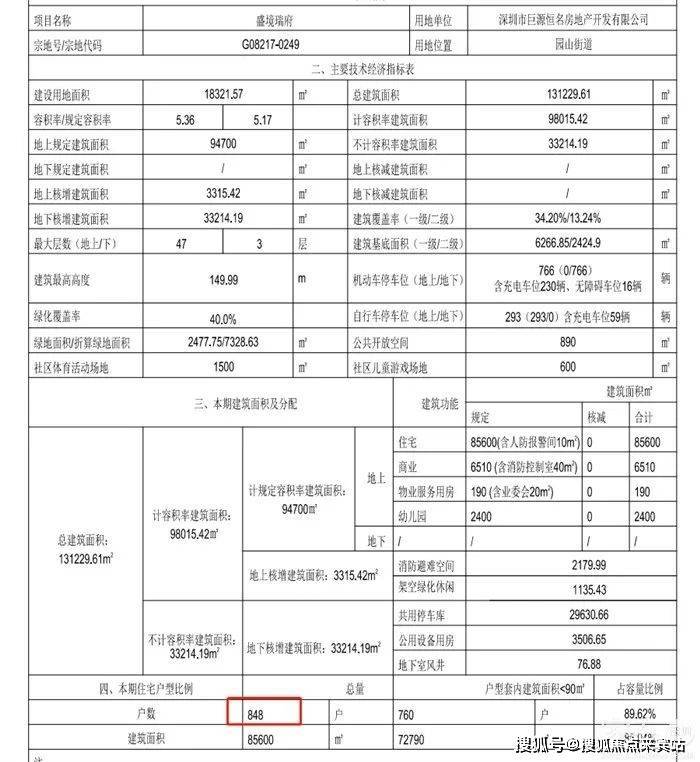 项目规划为4栋47/3层(149.99米),容积率5.36,车位766辆,住宅848套,套内小于90平760套,占比89.62%。