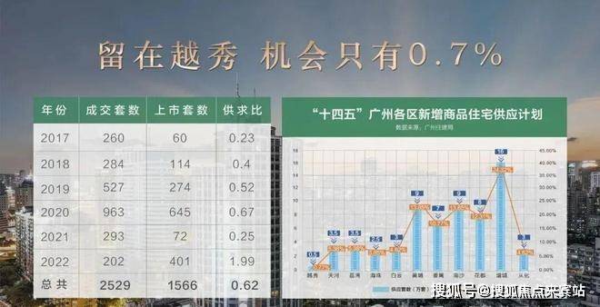 越秀区近十年几乎没有宅地放出,从过去六年的历史数据来看,新房平均供求比仅为 0.62,严重供不应求。在未来五年,越秀新房供应仅占全市的 1/130,而且在越秀区公园前,仅有君熙府这一座。