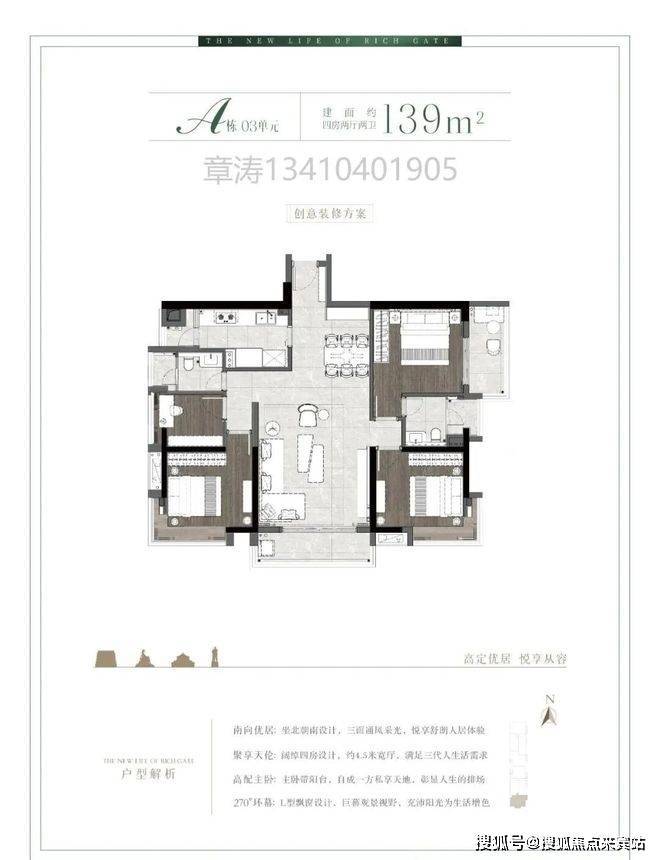 A栋03单元三面采光三阳台139㎡稀缺南向四房户型: