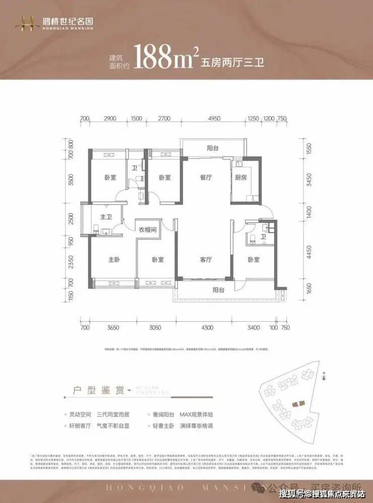 188㎡的5房2厅3卫,设计的是竖格局,南北通透双阳台,客厅4.3米开间,LDKB一体化设计,双主卧套间设计,5个卧室分别做到了3.65米/3.4米/3.05米/2.9米/2.7米的宽度,L型厨房带1个小生活阳台,公卫三段式分离,客厅阳台连接次卧出7.7米长的大阳台,主朝正南向。