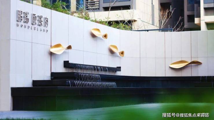◎ 二重叠水鱼雕,寻景而入,在步移景换间,邂逅一方“鱼跃龙门”的逸致水景,景墙运用葡萄牙金米黄石材,国际知名艺术家执笔艺术专利,让穿行于深圳湾1号的鱼雕艺术,游走在鹭璟府的恢弘叠水之上;