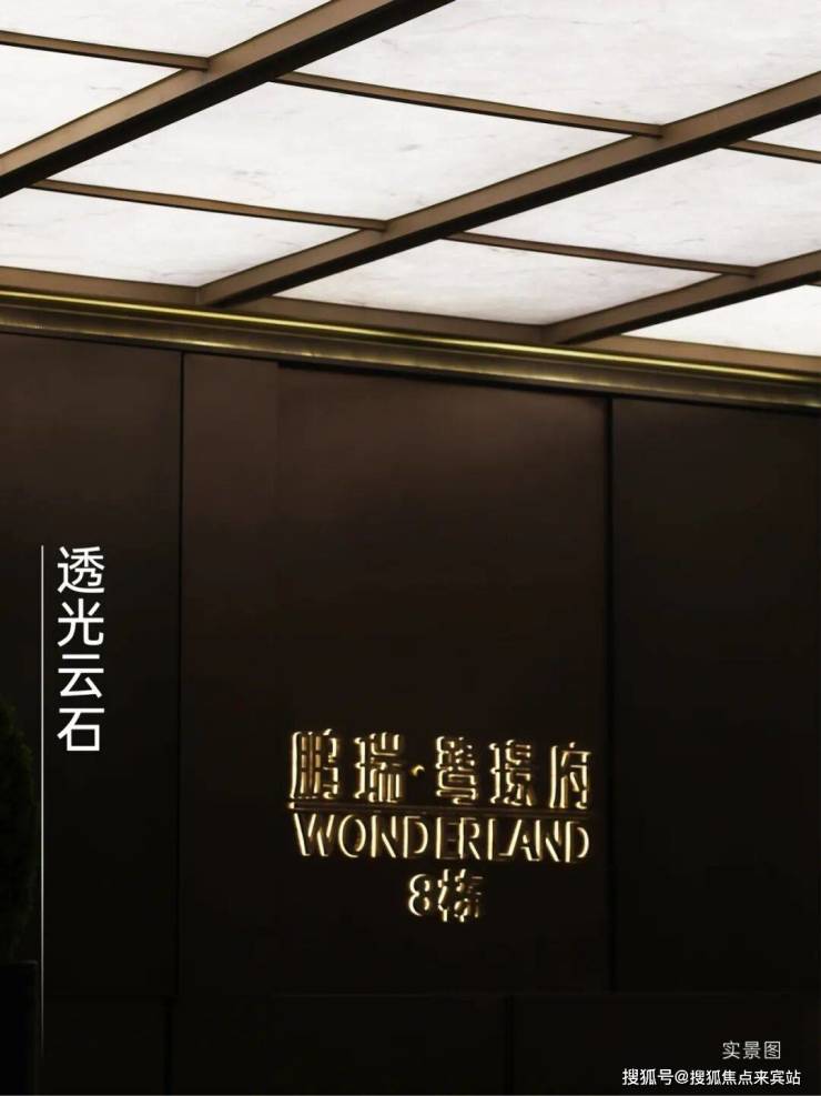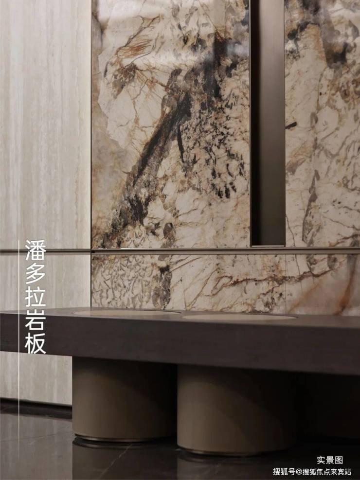 车库落客光厅采用透光云石天花板,映射出东方美学的高奢基因,车库入口景墙遴选昂贵的潘多拉奢石岩板铺装,花纹华丽且层次多变,昭示奢宅品味,