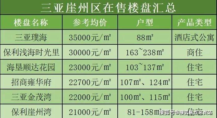 目前来看,崖州区共有6个楼盘在售。其中,除了三亚璞海与保利浅海时光里的海景房,均价3万+;其他4个楼盘,海垦顺达花园、招商雍华府、三亚金茂湾、保利崖州湾等,均价都是2万出头。