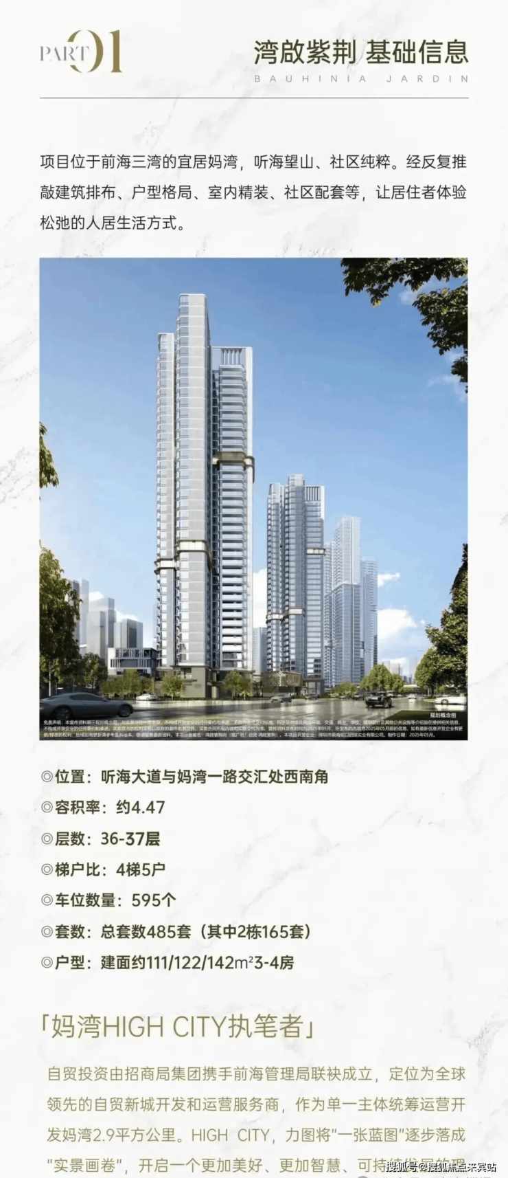 湾啟紫荆位于前海妈湾听海大道,占地约1.5万㎡,住宅建面约6.6万㎡,容积率5.14,共有三栋住宅组成,层高36-37F,共485户,车位595个,车位比1.1.2,4梯5户,主推约96㎡稀缺三房、111㎡3+1房、122㎡四房、142㎡四房。户型设计了大客厅、宽景阳台、阔景飘窗等,拥有山海河多重景观资源,计划品质精装交付。户型采用建筑新规设计,户户大阳台,4梯5户,分布式电梯设计,独立电梯厅。