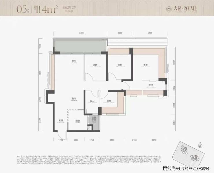 这个就是05的户型图,114平4房,传统动静分离竖厅户型,厅出大阳台,延伸到次卧,主卧和其中一个次卧双面飘窗采光,加上厨房外的设备平台,赠送面积大。