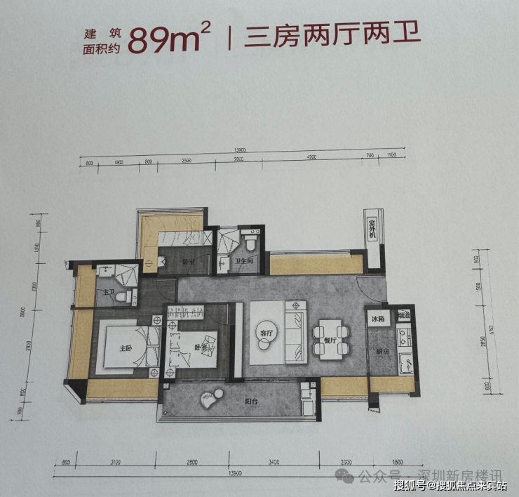 建筑面积约89㎡户型-3房2卫(横厅)