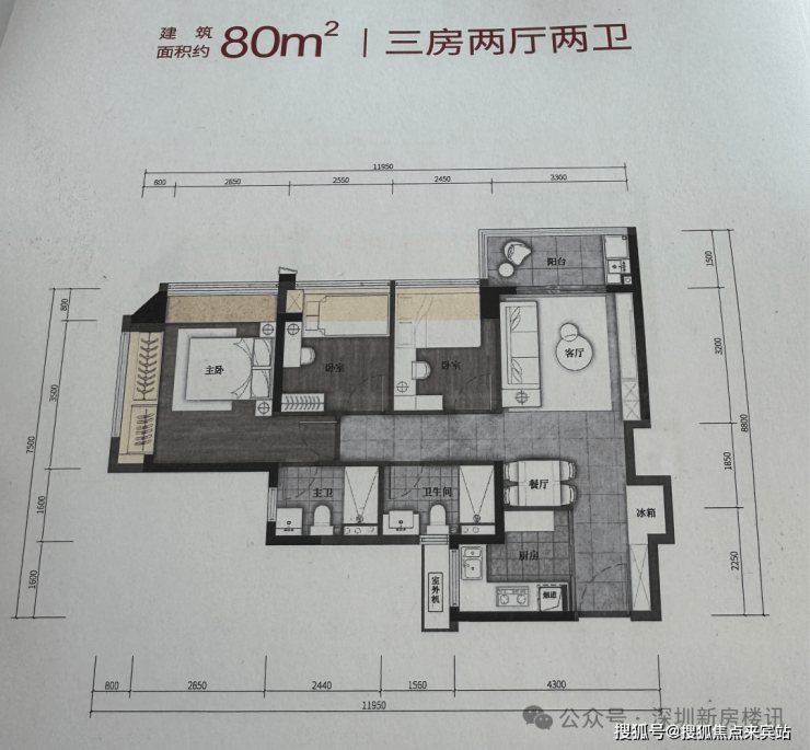 建筑面积约80㎡户型(竖厅)-3房2卫