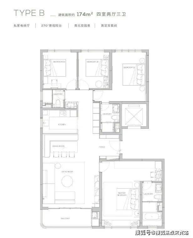 :独享私家电梯厅,约 7.2m² 森幕宽厅搭配 LDKB 全明户型,空间开阔且采光极佳,适合追求精致生活的家庭。