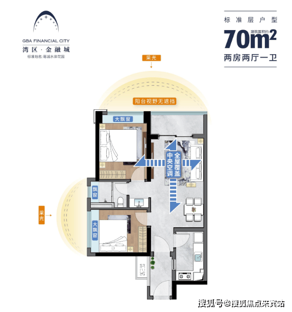 湾区金融城的70平方米两居室户型在整个横沥板块中独一无二。这个户型特别预留了入户空间,提高了私密性,并且可以放置鞋柜等日常物品,增加了实用性。