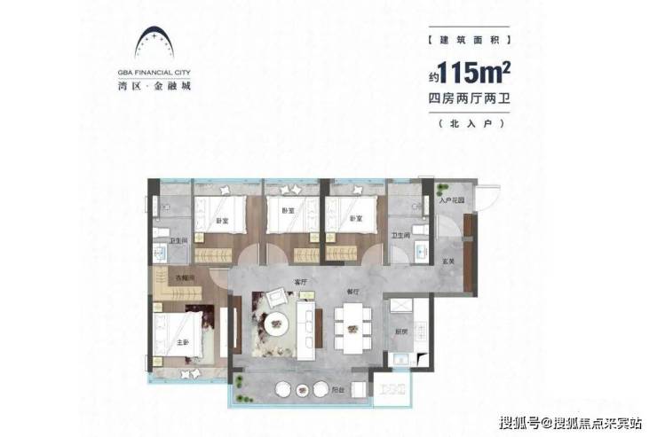 湾区金融城还提供了建面约115平方米的四居室户型,这个户型的特点是四房格局,非常适合二胎家庭。
