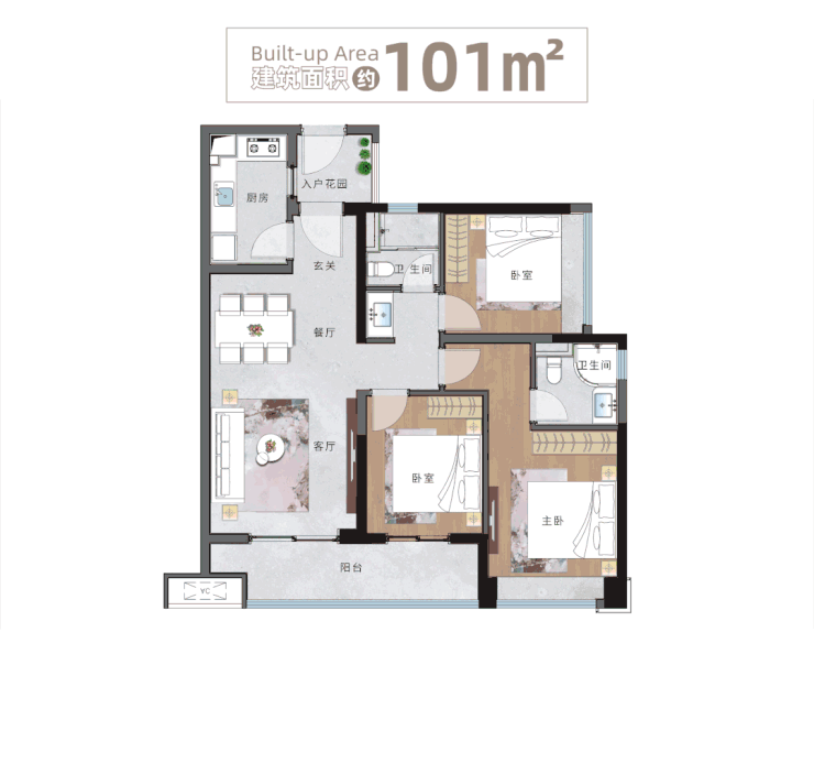 湾区金融城还提供了建面约101平方米的三居室户型,这个户型既具备实用性,又兼具舒适性,非常适合三代同堂的家庭需求。