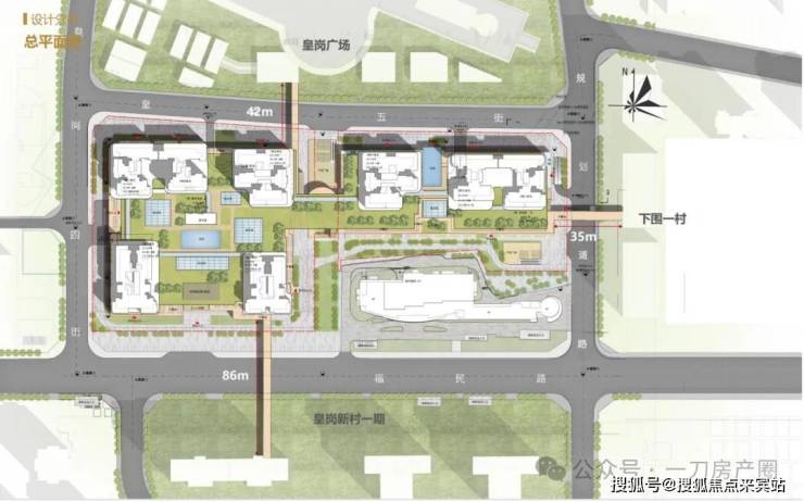 项目一期由福民路、皇岗二街、皇岗四街、皇岗五街围合而成,总占地面积约3.14万㎡,总建筑面积约27.3万㎡,住宅建面约为20.3万㎡,商业建面约为7万㎡;整个项目以“立于城市中轴,缔造时代标杆”为核心理念,旨在构建一个融合现代与历史人文特色的城市大综合体。
