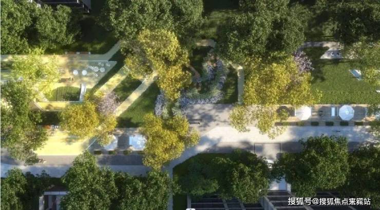 约2.6万㎡自然景观,以常绿乔木为主,搭配四季植物造景,配合设置开放共享空间、主题花园、趣味乐园、健身活动区等不同功能分区,旨在打造一个适老适幼、四季色彩更迭的诗意环境。