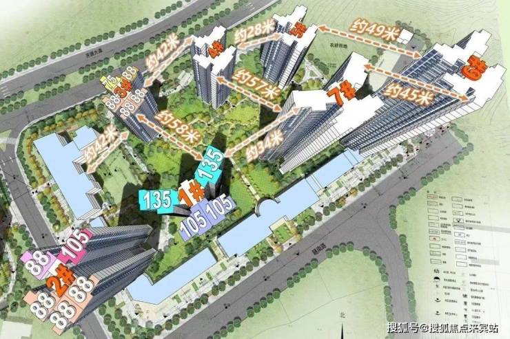 其一,散点式排布,每栋楼都是独立的,楼栋左右有三四十米的间隔,最大化提高了楼栋两侧单边位的采光面和视距。