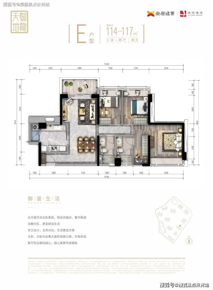 E栋56层4梯6户,112-117㎡三房,其中C栋层高3.15米,BDE栋层高3米