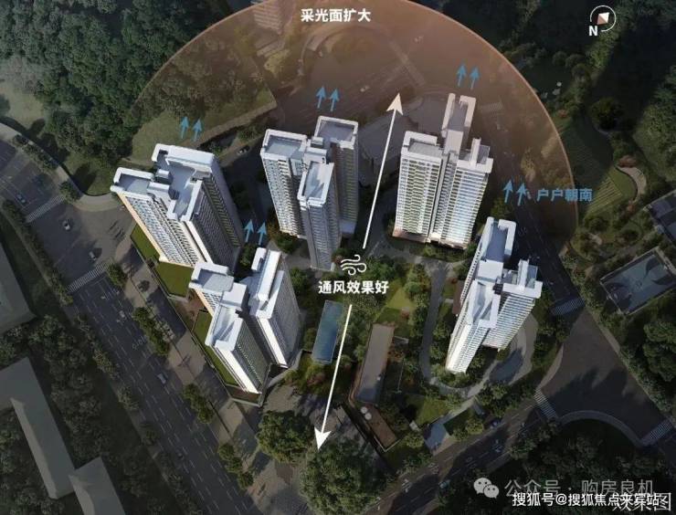 楼栋设计采用点式布局,并将楼体进行48°扭转,通过楼栋错位,实现户户朝南,扩大每户采光面的同时保留了居住的私密感