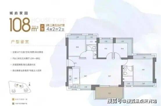 108㎡四房两厅两卫:横厅南北通透格局,进门独立玄关,增加私密性和仪式感。客餐厅 6.4 米大开间,LDKB 一体化,五开间朝南,主卧双飘窗通透设计,全屋 10 个凸窗,采光和通风极佳。四房设计适合大家庭居住,得房率约 91.88%(包含赠送),阳台主朝西南或东南向。