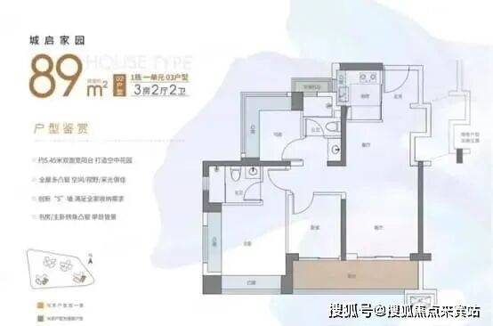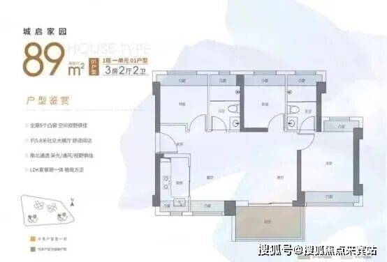 89㎡三房两厅两卫(竖厅):竖厅格局,客厅 3.4 米开间,LDKB 一体化,S 墙设计预留冰箱卡槽位,动静分区。三开间朝南,主卧和一个次卧 270° 飘窗设计,客厅连接卧室出 5.75 米长的大阳台,采光和通风佳。得房率约 87.2%(包含赠送),东南朝向。
