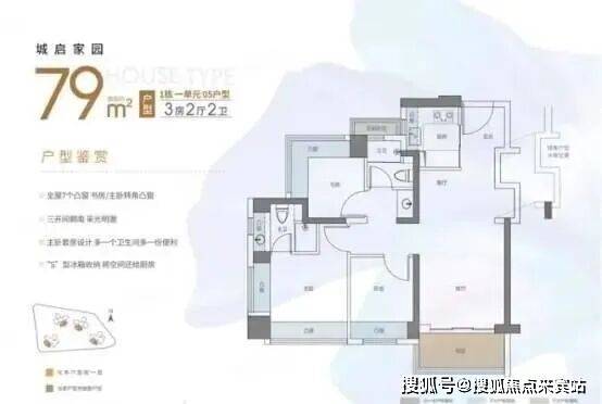 79㎡三房两厅两卫:采用经典竖厅格局,客厅 3.3 米开间,LDKB 一体化设计,S 墙预留冰箱卡槽位,动静分区。三开间朝南,主卧和一个次卧带有 270° 飘窗,增加采光和空间感。U 型厨房,操作空间充足,公卫三段式分离,使用效率高。得房率约 88%(包含赠送),东南或西南朝向。