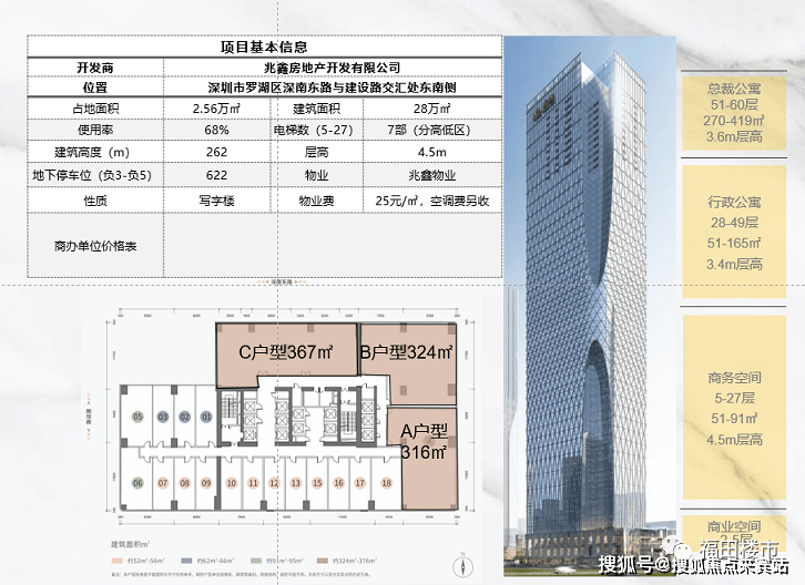 项目占据罗湖金融中心,精英人士汇集。拥揽万象城、金光华等百万明星商圈,由A塔、B塔和裙楼三部分组成。A塔高约261米,是一座办公和高端公寓混合功能的地标塔楼;B塔则为一座标准设计的高层住宅楼;裙楼连接两塔约2.8万㎡商业已开业。