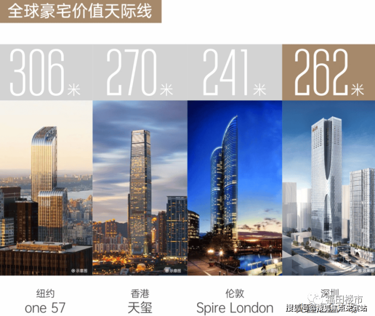 262米地标代言罗湖兆鑫汇金广场,深南大道封面地标,以其262米的超人之姿比肩全球顶级豪宅。世界顶级豪宅同样存在着一条价值天际线——纽约的one 57、香港的天玺、伦敦的Spire London,包括深圳的深圳湾壹号,作为各自区域的最高居所,矗立于当地人居的价值之巅。