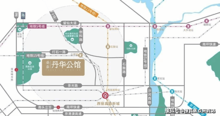 项目周边有5号线的留仙洞站(距离较远,步行距离1.8公里)、13号线(建设中,预计2023年年底开通)石鼓站(距离约900米,步行10分钟左右)和最近的地铁站15号线(建设中)打石一路站,直线距离约400米左右。