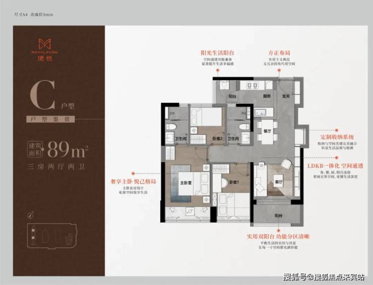 89㎡三房二卫A/B户型,位于1栋一单元,两开间阳台,主卧都有双面凸窗赠送。
