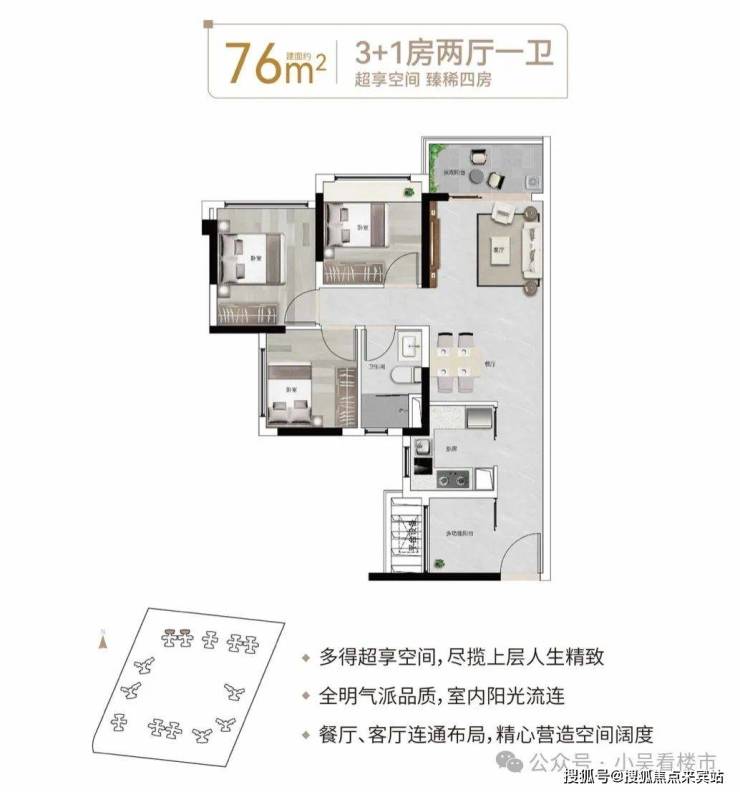 建面76平3+1房,该户型直面自然山体,窗外山景尽收眼底,全明采光设计也保证了室内的通透性,主卧、次卧、卫生间、厨房、客餐厅,每个重要的生活区域都能随时拥抱阳光与清风,总价310-330万左右。