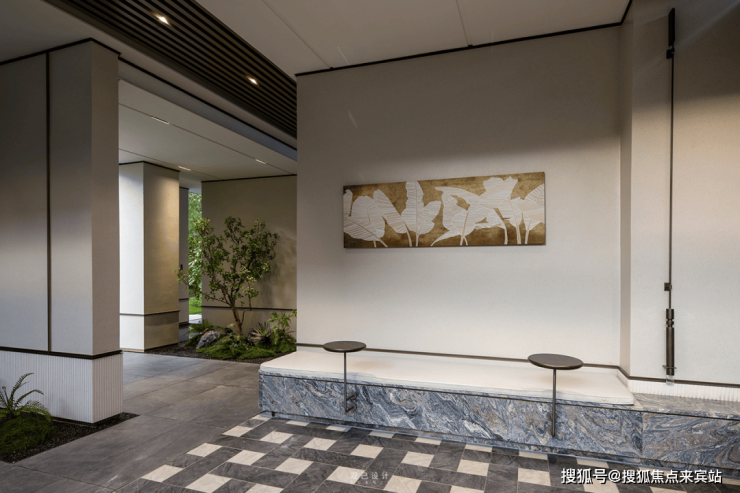 5栋的「云栖·西派艺术馆」 雕塑长廊与立体庭院串联,巧妙地陈设“风”字的金属雕塑、形似层峰叠峦的艺术壁画、融入白云山沉淀的绿宝石。
