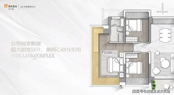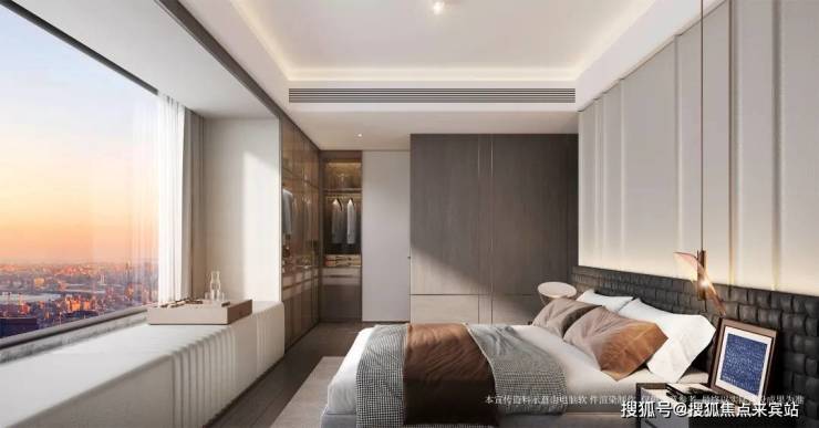 最吸睛的是它的主卧去到28㎡,而且做了约12米长的270°无遮挡U型飘窗,室内光线敞亮,空间通透,非常有豪宅感。
