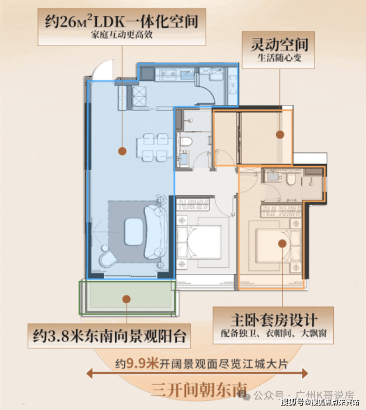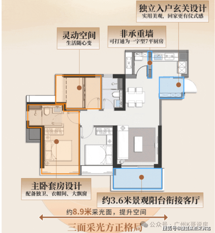 比如,采用少承重墙化设计,次卧可打通或隔开,生活阳台也能与厨房打通出7平全明空间。
