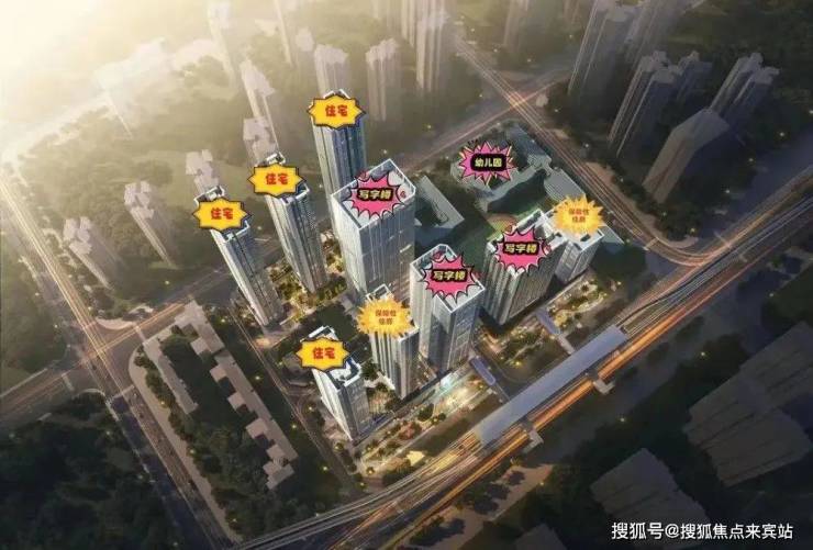 项目由4栋45F超高层住宅、3栋40F、30F写字楼、1栋45F保障房、1栋3F幼儿园以及一所九年制学校组成,未来将建设成为集住宅、办公商业为一体近40万㎡的TOD城市商住综合体项目。
