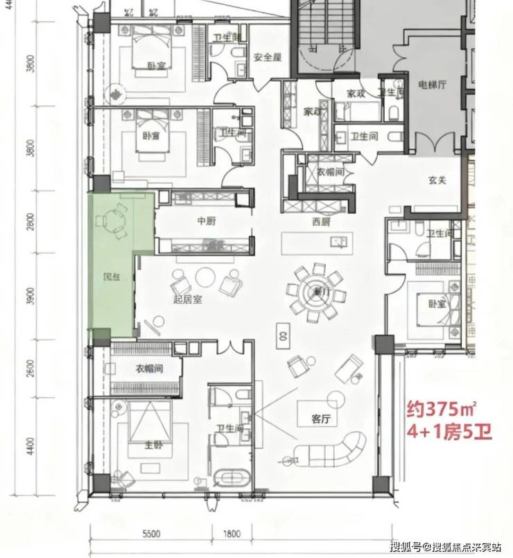 ——高区 40F起(150-200米)是约370-375-403㎡4+1房五卫+家庭厅+家政套间;