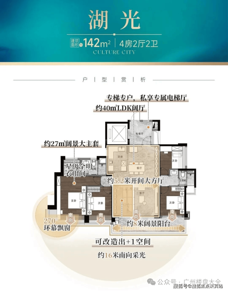 建面约142㎡的四房户型,做到约16米南向采光,站在约8米全景阳台,约1.2万㎡湖景扑面而来,高层还能望江。配置了独立大堂、电梯厅和专梯入户,私密性和归家仪式感更强。
