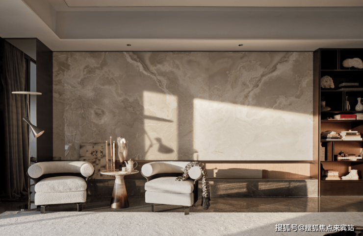 繁华转向静谧,拾阶而上,迈进艺术序厅,高耸的叠瀑和艺术装置作为背景,迎宾水景搭配珍贵的罗汉松,给归家第一画面带来视觉的强烈感知,叠瀑墙材质采用了原产巴西的花岗岩石材“碧潭金沙”,对景定制化格栅景墙,使用海蓝宝石材与不锈钢金属拼接,既符合高阶人士的高端审美,又呼应润系的价值理念。