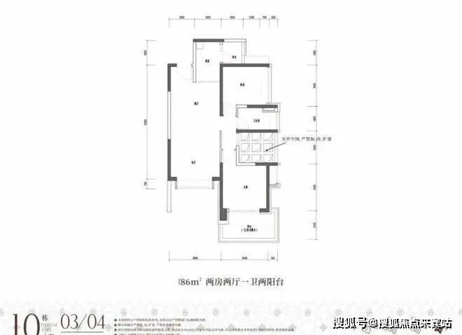 10栋03/04户型,建面约86㎡,原始结构是两房两厅一卫两阳台,奇数层和偶数层都是卧室出阳台,主卧与公卫中间有一块镂空的地方,搭板的话改个三房没啥问题。