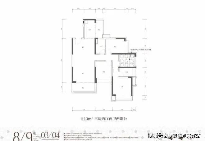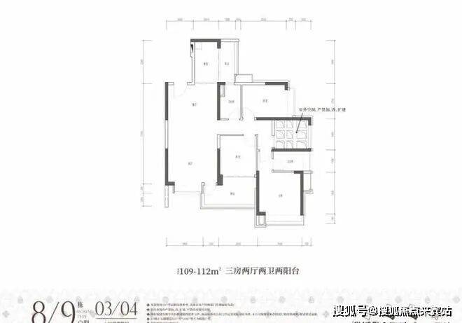 8/9栋03/04户型,建面约109-113㎡,原始结构是三房两厅两阳台,奇数层客厅正出阳台,偶数层客厅侧出阳台,奇数偶数层厨房都有生活阳台,且主卫与次卧之间有一块镂空的地方,搭板并入主卧做书房或者单独做儿童房使用都可以,不能搭的话结构也还说的过去,就是得房率会低一点。