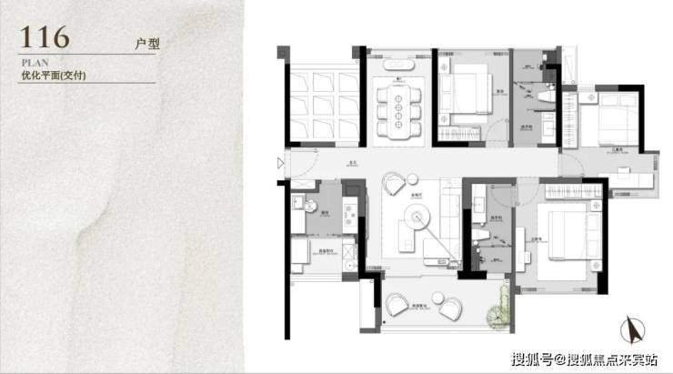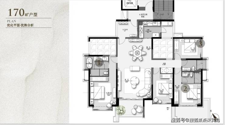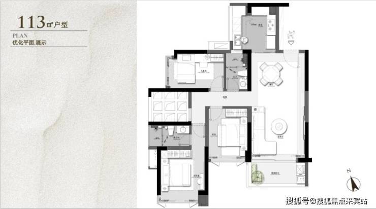 大尺度的阳台空间,约113m²户型的阳台,面宽可达约4米,进深约1.7米,是市面上大部分同户型竞品所难达到的尺度。且阳台、露台数量还多,通风采光当属市场头筹。