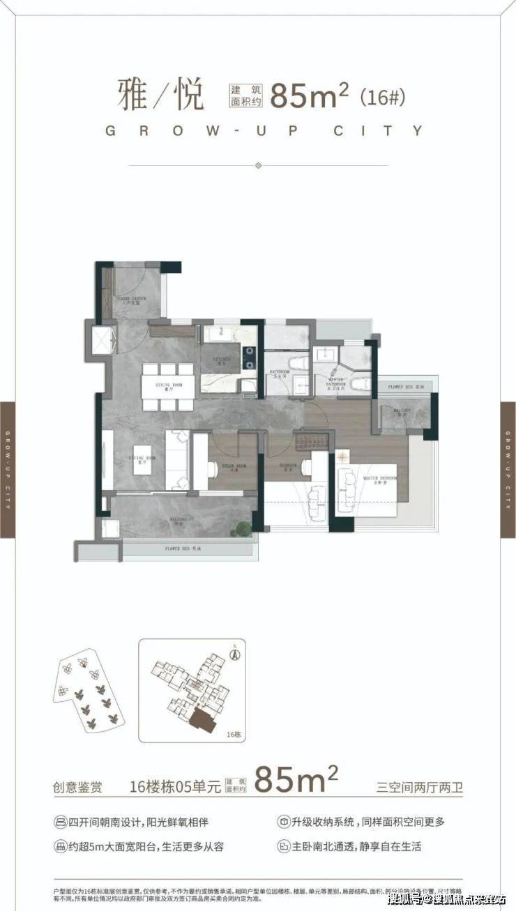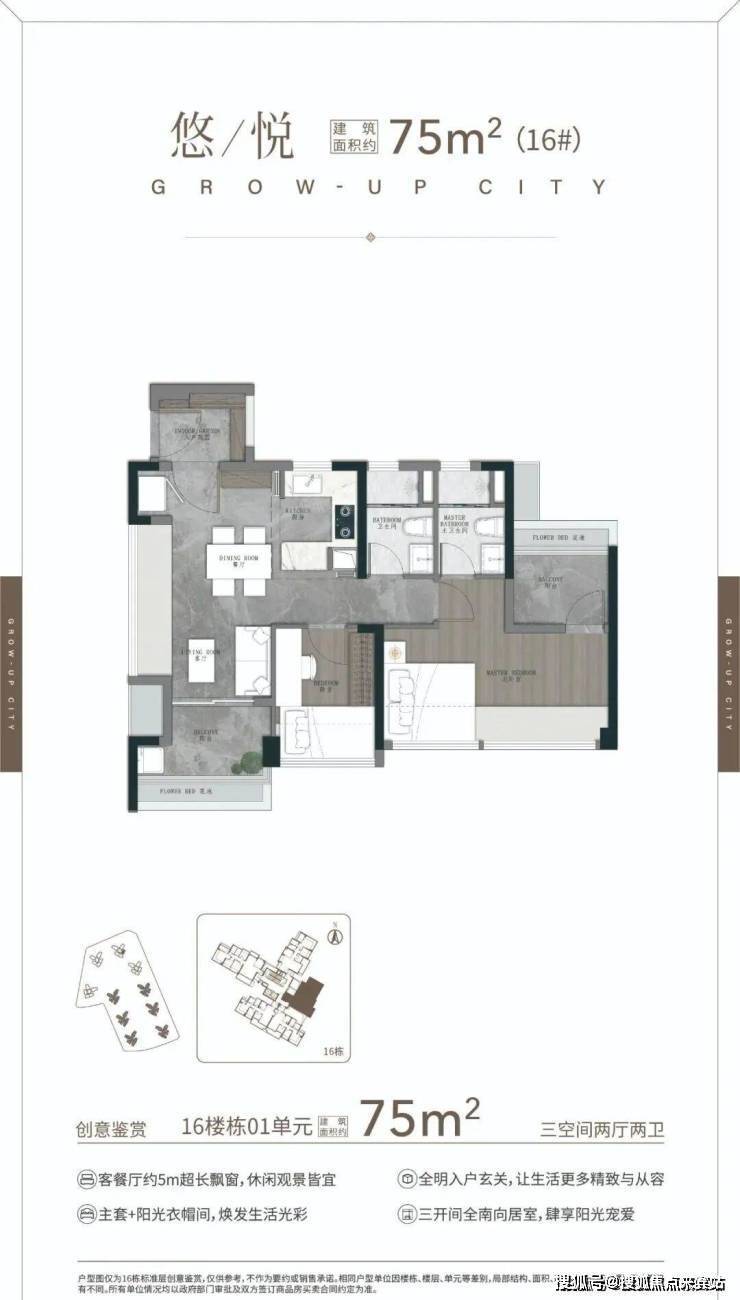 75㎡三空间两卫,年轻人主城上车首选 ,四开间朝南 全明转角玄关 开放式厨房,开阔景观阳台 南北对流主套&衣帽间。