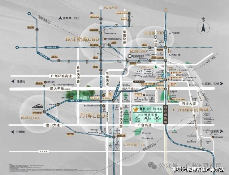自驾出行:兴业大道/南大干线,番禺东西向发展大动脉,串联万博CBD/广州南站等板块;南沙港快速、新化快速、番禺大道:无缝衔金珠琶,另经金光东隧道,可速达大学城一期。