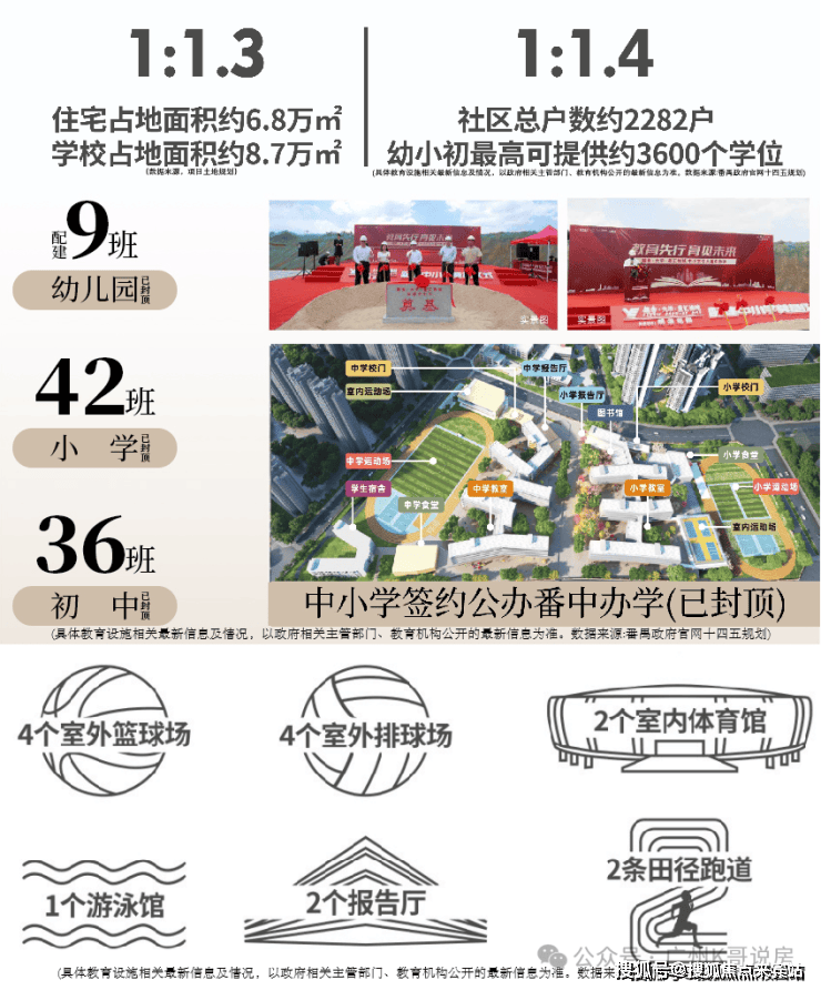项目配建42班小学+36班中学的九年制学校,引进番禺中学教育集团办学,已开学。